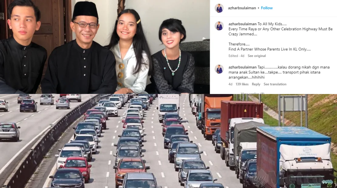 A few days ago, Azhar Sulaiman posted a photo of him and his 3 children combined with a photo of heavy traffic on a highway. As seen in the captions, he advised his kids on what they should look out for in a future partner. “To all my kids, whenever there’s a celebration like Raya, there is always heavy traffic. Therefore, please find a partner whose parents live in Kuala Lumpur,” the 52-year-old wrote.