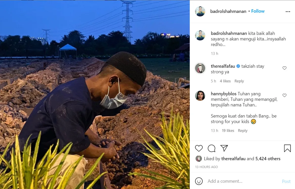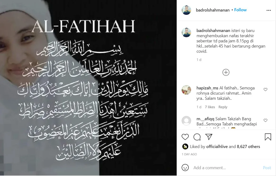 The news was personally confirmed by Badrol Shah on his Instagram. The actor said that he was informed of his wife’s passing on Thursday morning through a video call by doctors who attended to his wife.