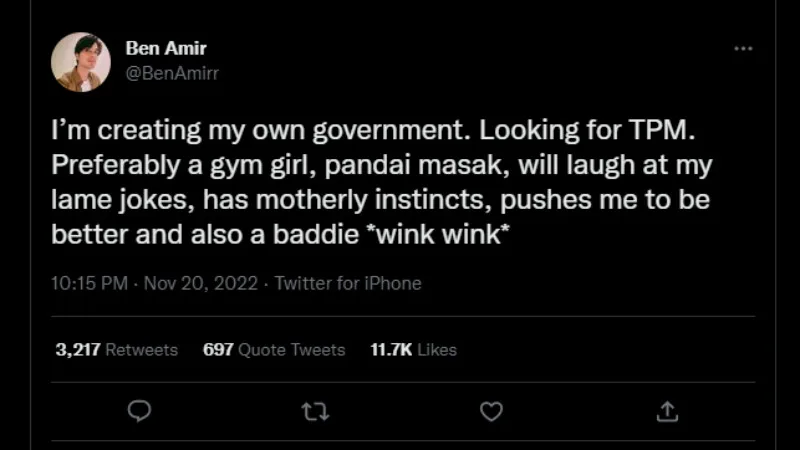 After voting over the weekend, Malaysian actor Ben Amir posted on his Twitter last night (Sunday, 20th November) that he’s “creating” his own government. “I’m creating my own government. Looking for TPM. Preferably a gym girl, knows how to cook, will laugh at my lame jokes, has motherly instincts, pushes me to be better, and also a baddie *wink wink*,” he tweeted.