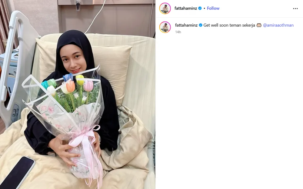 Yesterday (16th June 2025, Monday), Fattah surprised fans when he posted a photo of Amira on his Instagram account. The picture depicts the 31-year-old singer in a hospital bed. Despite the situation, she’s smiling while holding a flower bouquet. In the captions, the “Bidaah” actor wrote a message for Amira, “Get well soon teman sekerja (co-worker)”, wishing her a speedy recovery.
