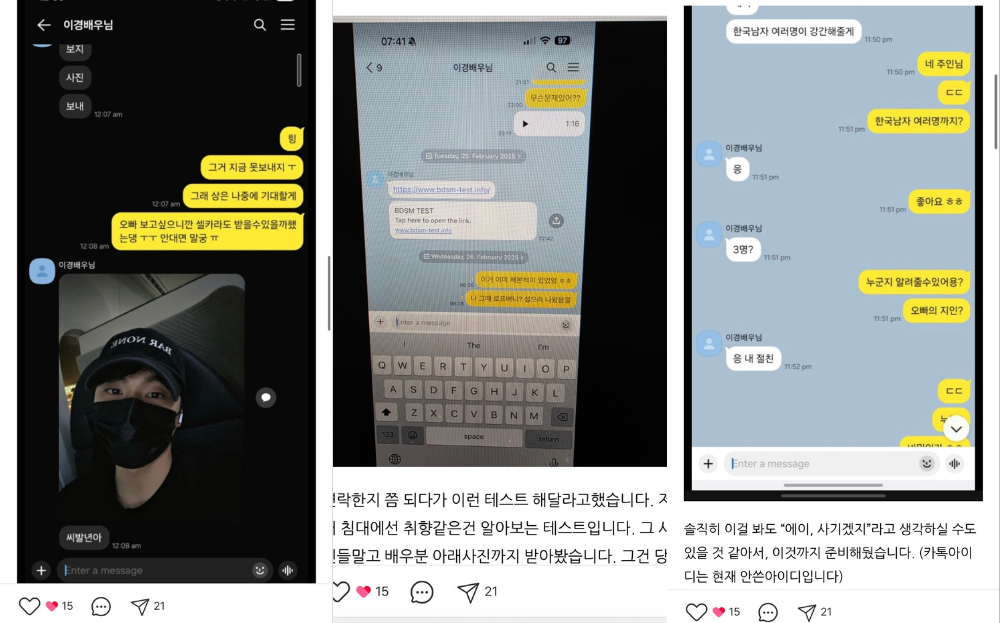 It’s believed the interaction between the two began through Instagram messages and later moved to the KakaoTalk messaging app. In one screenshot shared, Lee Yikyung appeared to ask the victim about her bra size. He also allegedly told the victim that he would have several men rape her. There were also conversations where the actor reportedly asked for the victim to share photos of her private parts, and then cursed at her when she refused to.
