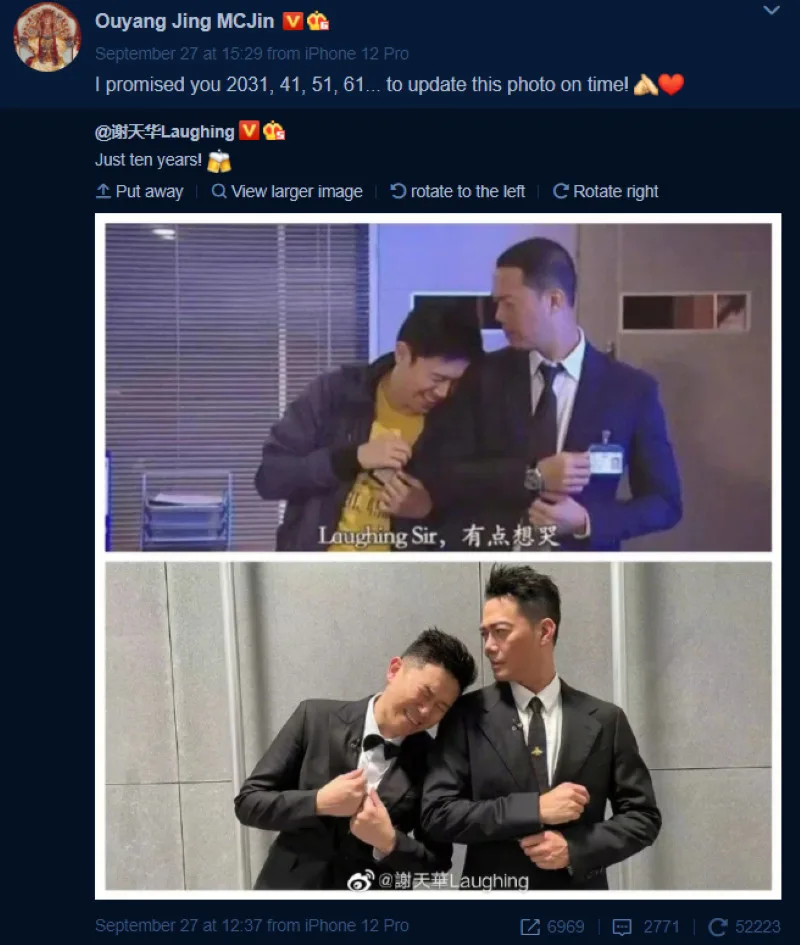 One such pair is Michael Tse (謝天華) and MC Jin (Jin Au-Yeung, 欧阳靖) from the drama “Lives of Omission (潜行狙击)”. On 27th September, the duo took a photo imitating a scene from the drama to commemorate the show’s 10th anniversary.