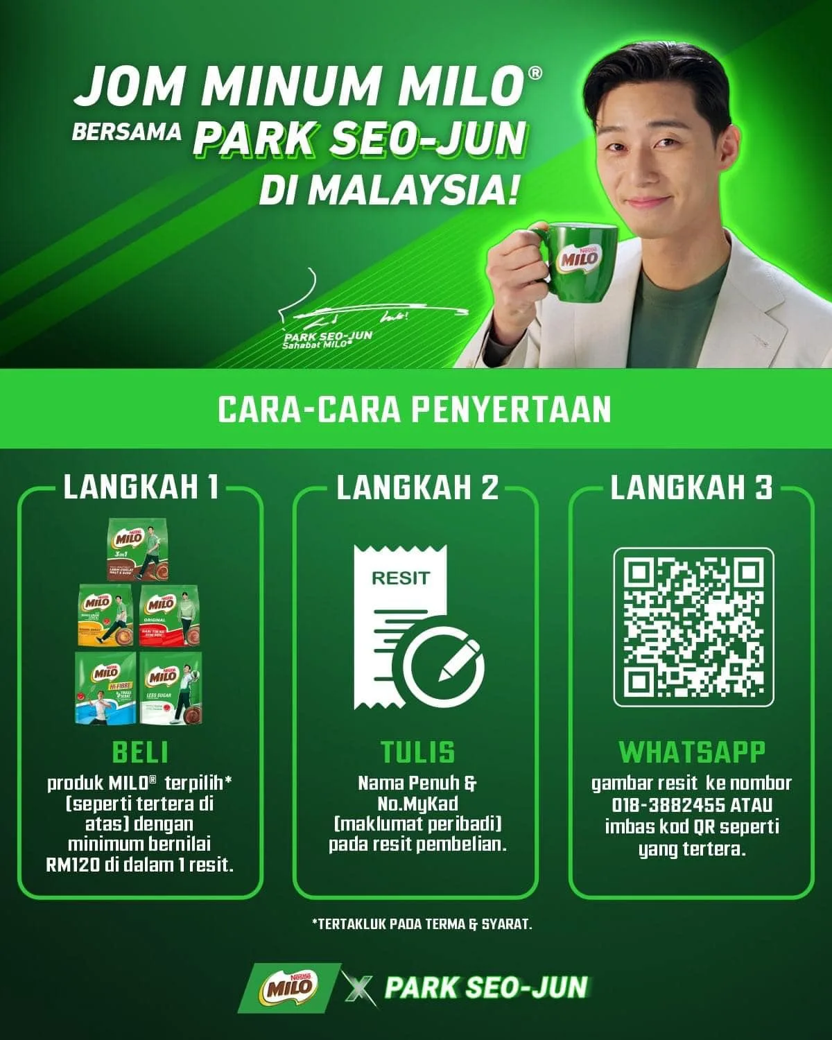 There’s no word yet on the exact date or venue at the time of writing. But Milo is offering fans a chance to win passes to his meet and greet in Kuala Lumpur (likely sometime this month). This, of course, involves purchasing the new Milo products featuring Park Seo Joon with a minimum expenditure of at least RM120 in a single receipt.