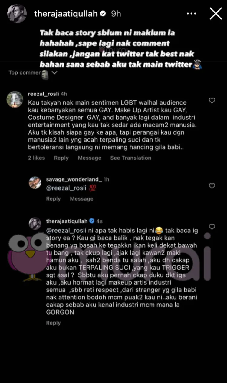 Prior to the incident above, another individual called him out for the controversial Pride flag-burning post. As seen in the screenshot above, the netizen who goes by @reezal_rosli defended queer individuals who work in the entertainment industry and told Raja Atiq to mind his manners. The actor responded to the comment claiming that he fully respects those in the industry and that the netizen was just spewing nonsense.
