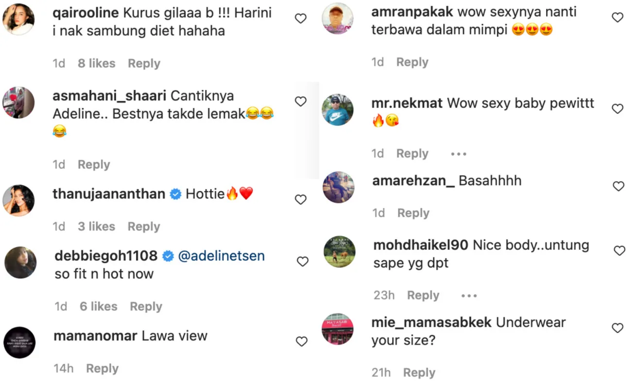 The post received positive and supportive comments from fellow actors such as Debbie Goh, and Thanuja, who wrote, “You’re so fit and hot now” and “Hottie 🔥💕” respectively. Some netizens responded to the video positively, commenting, “You’re so thin! I will continue my diet today haha” and “Adeline is so pretty”.