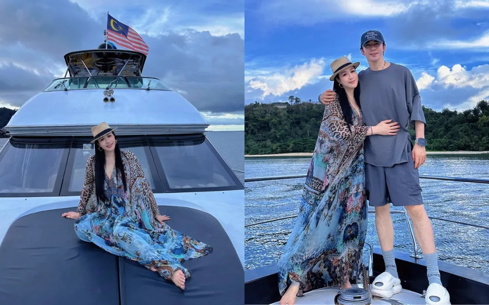 The actress shared the photos on XiaoHongShu, posting them with the caption, “I caught a super romantic sunset over the sea in Malaysia”. According to the post, Christy was in Malaysia on holiday with her husband, Shawn Zhang (张伦硕), and her daughter, Cayla. While in town, the family spent time with some friends and rented a small yacht to enjoy the sunset from the sea.