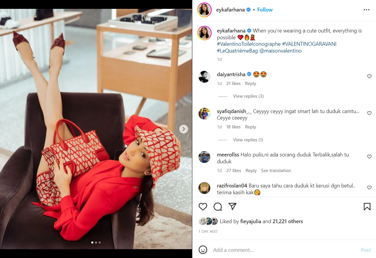 Just recently, Eyka once again found herself in hot water over a post she uploaded on her official Instagram account. She was see, as pictured, striking a pose on a single sofa. Eyka was clad in a pink top with a printed bag and bucket hat from Valentino.