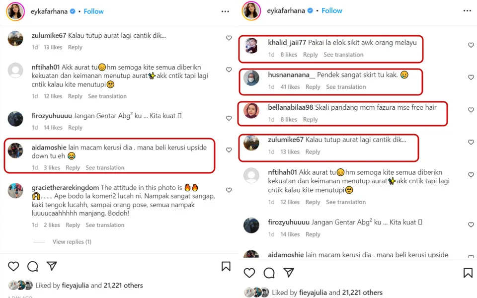 A few fans of the fashion-forward celeb also expressed their hopes that she will dress more appropriately in the future. Some of the comments left by them include: “Please wear something appropriate. You’re a Malay-Muslim woman,” “The skirt is too short, sis,” “Where can I buy the upside-down chair?” and “At first glance, I thought it was Fazura (in the post).”
