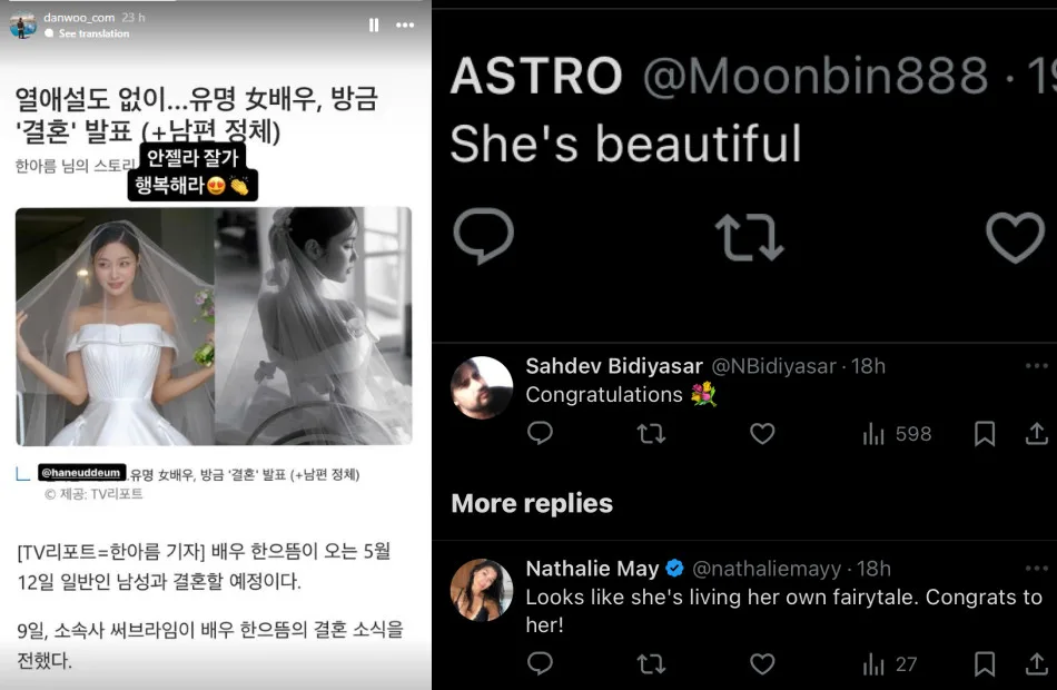 A netizen commented on Allkpop’s Twitter post of the artist’s wedding announcement saying “Looks like she’s living her own fairytale. Congrats to her!” While another netizen praised her for her beauty. Not only that, but a fan also posted what seems to be a screenshot of her wedding announcement on their Instagram story. The post came with a caption saying, “Goodbye Angela. Be happy,” a line said by her character Angela in Netflix’s “Celebrity” (2023).