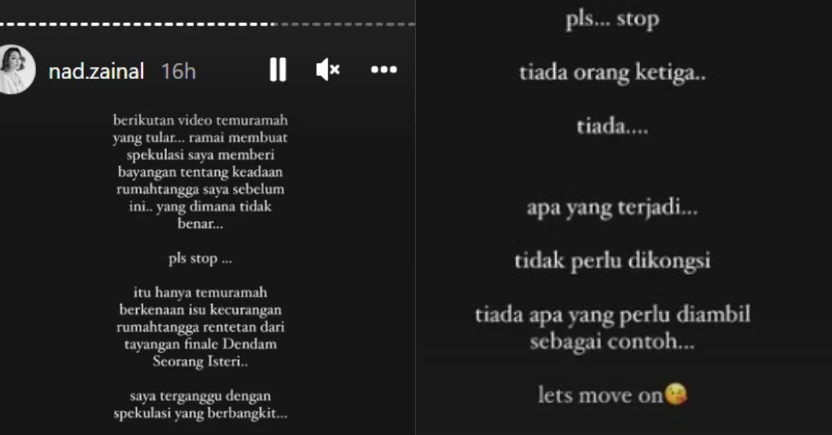 The actress finally shut down all the speculations in her Insta Stories saying that none of them are true. “Please stop. The interview was about certain scenes from the “Dendam Seorang Isteri” finale. There is no third person,” she clarified. Nad also insisted that the public does not need to know what happened between her and her ex-husband and asked for the public to move on.
