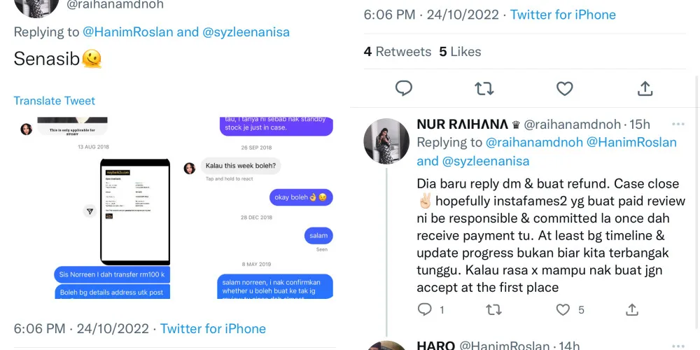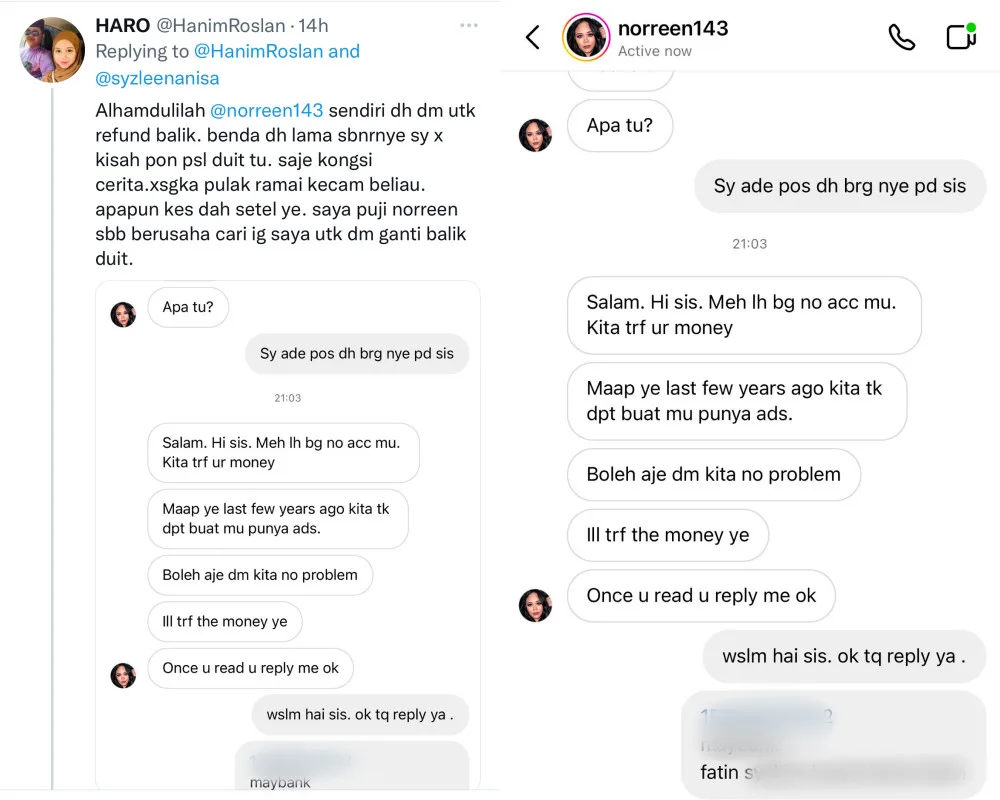 “Alhamdulillah. Noreen herself has messaged me to return my money. This issue is (so) old to me that I don’t even care about the money anymore. I was just sharing a story, I didn’t think people would condemn her. Nevertheless, the case is settled. I praise Norreen because she searched hard for my Instagram account, just to refund my money.”