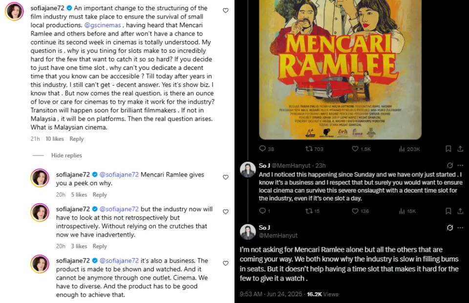 Earlier this week, actress Sofia Jane took to both Instagram and Twitter to speak about “Mencari Ramlee”, the film in which she stars alongside Tony Eusoff and Mimi Lana, and GSC’s screening schedule. She revealed that she and the rest of the team involved in the project had been informed that the film would be withdrawn from GSC outlets due to low audience turnout. However, she questioned the reasoning behind the chosen screening times and called for an explanation.