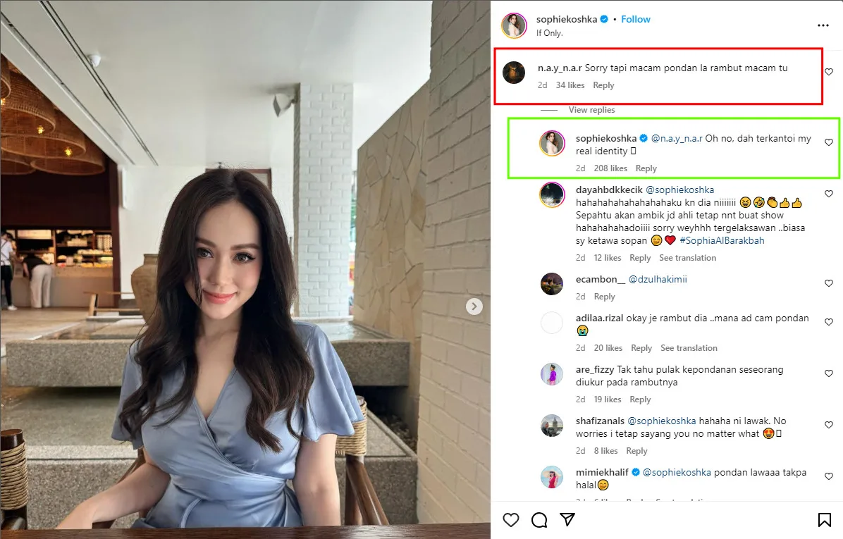 As seen in the screenshot above, not long after posting photos of her new hairdo, a netizen commented on Sophia’s post saying, “Sorry but that hairstyle makes you look like a pondan”. Usually, many would take offence to such a comment, but instead of being angry and calling out the user for their rude remark, the actress simply replied, “Oh no, my real identity has been exposed!”