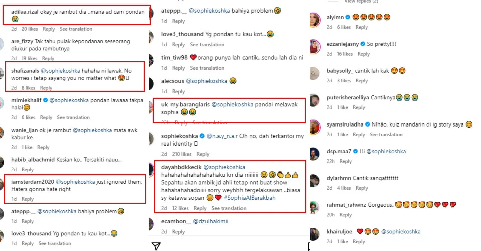 Fans were mostly amused by the model’s witty response to the disrespectful individual. Some were wondering how the netizen came to the conclusion that Sophia’s hairstyle could look similar to that of a pondan‘s while others commented that the “Miimaland” star looked beautiful regardless. Of course, a few came to her defence by slamming the netizen for their uncalled-for opinion. As for the rest of the comments on the same post, many, including celebrity friends, were mesmerised by the actress’s beauty.