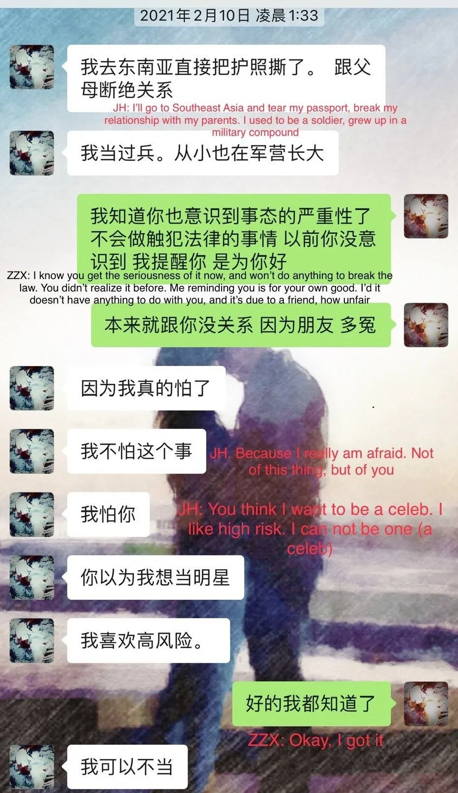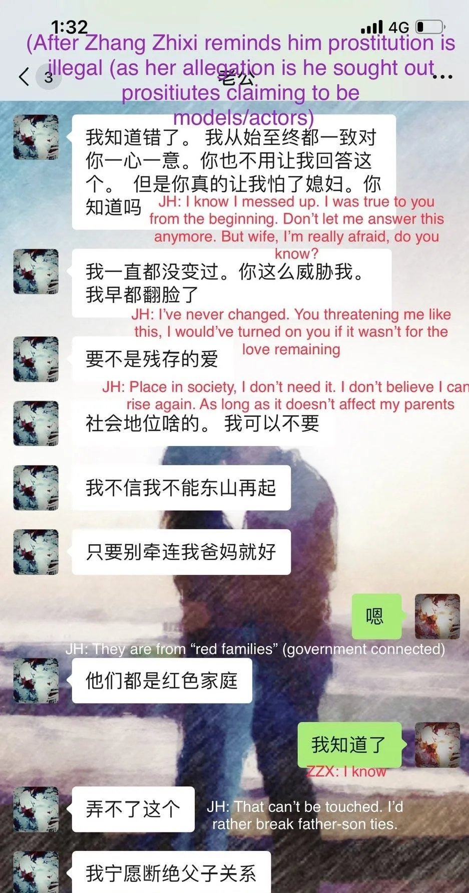 Zhang accused him of seeking prostitutes masquerading as actors and models, and reminded him that prostitution is illegal. At the threat of going public with the allegations, Jin Han stated he would break all ties with his government-connected family to save them. He values his family’s reputation more than his career. Zhang backed off then.