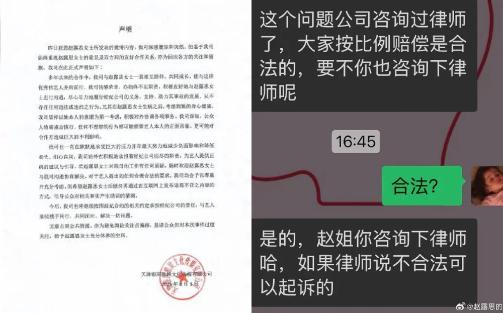 However, Zhao Lusi claimed the agency failed to honour this agreement, resulting in 2.05 million yuan (RM1.21 million) being deducted from her personal account. She stated that she spent eight months negotiating with the company, only to be met with excuses. Most of her staff had allegedly quit during this time, leaving her to deal with the situation on her own.