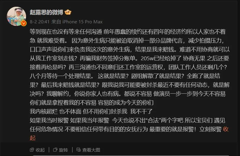 On August 4th (Monday), Zhao Lusi went on a live broadcast to address the situation further and respond to questions from her audience. When asked why she hadn’t dealt with the issue privately, she explained that remaining silent no longer brought her peace. She also made a shocking claim: while she was ill, instead of being taken to the hospital, her production team had allegedly locked her in a room, saying she was cursed and needed an exorcism.