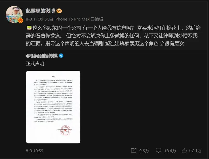 Her former agency, Galaxy Cool Entertainment, then released an official statement, denying all claims made against them. The post ended with a warning to Zhao Lusi, urging her to stop making “ambiguous” posts that could lead to the spread of misinformation. Zhao responded directly, questioning the agency’s statement and demanding accountability. “What exactly are you shocked about? Where were you when I was taking medicine and inhaling oxygen more than a week ago?” she asked.