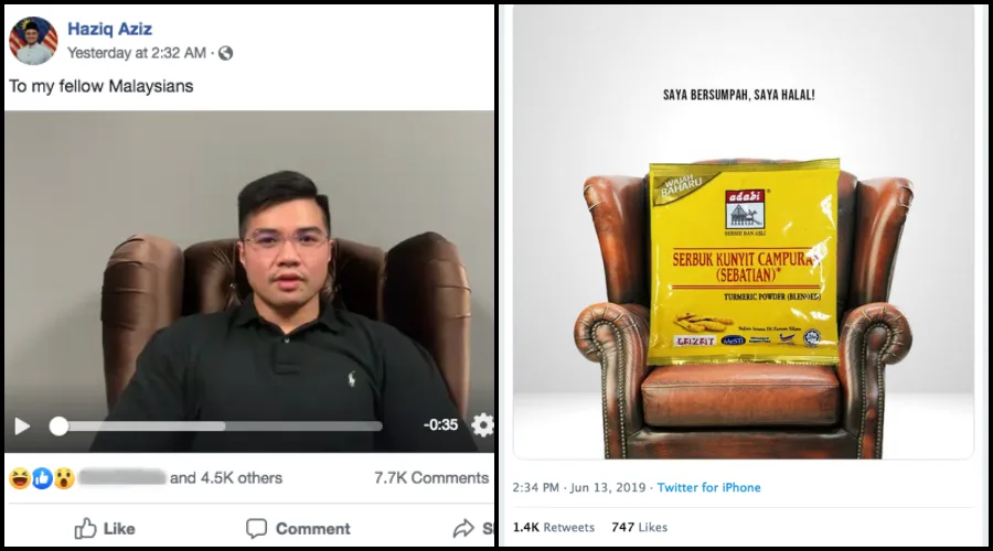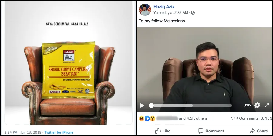 The photo shows the powder sitting on a brown sofa chair with a white background and a text that read “Saya bersumpah, saya halal” (I swear, I am halal) – sounds familiar?