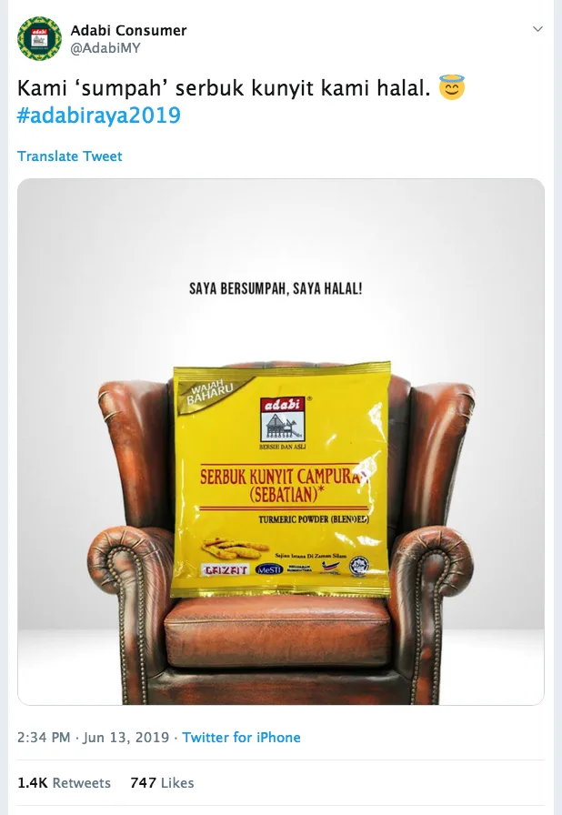 Adabi Consumer Industries Sdn. Bhd. has shared a photo of one of its famous products, the ‘serbuk kunyit’ (turmeric powder) in a cheeky tweet which features a double entendre!