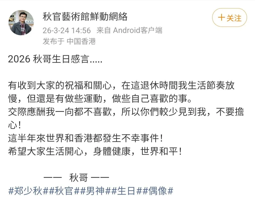 Amid growing concern over his lack of updates, the actor recently made a rare public comment on social media. On 24th March 2026 (Tuesday), Adam’s Lunar birthday, a Weibo account under the username “Adam Cheng Art Museum Live Network (秋官艺术馆鲜动网络)” shared a post. Writing the post is “Brother Cheng”, believed to be the actor.