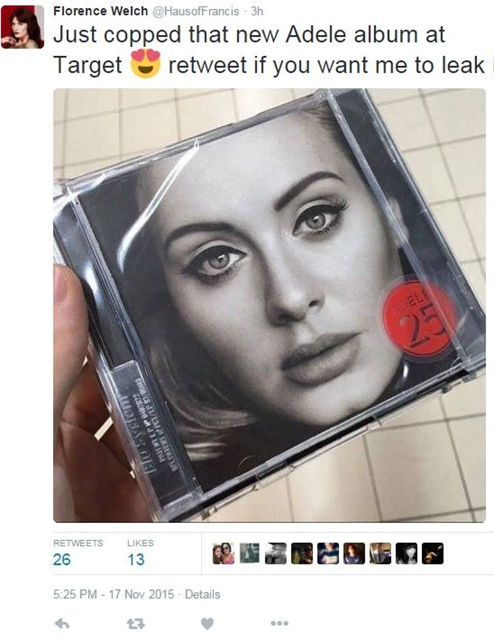 Apparently, a Twitter user claimed that she had purchase the album from American retailer Target and even posted a picture of the singer’s album cover on her page. She even asked people to retweet her post if they want her to leak the album. However, a rep for Adele later told Billboard that the Target sales were not true.