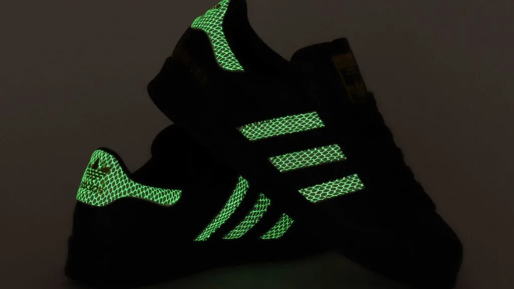 The glow-in-the-dark snakeskin subtly incorporated into the side three stripes and heel, creates a varying expression depending on the brightness.