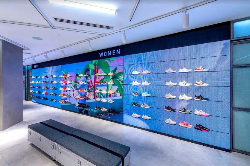 6. LED sports performance wall that showcases the different shoe range from Ultraboost to X9000