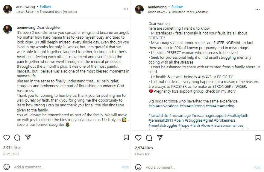 Malaysian actress Aenie Wong (王淑君) recently commemorated the passing of her second child on Instagram. According to the actress, she had lost her daughter to a miscarriage at 21 weeks. However, her daughter’s passing has led Aenie to offer support to others like her.