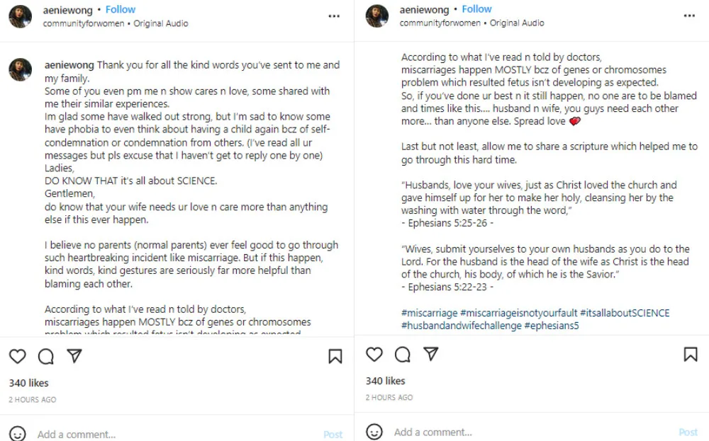 “Ladies, DO KNOW THAT it’s all about SCIENCE,” she stated. “Gentlemen, do know that your wife needs your love and care more than anything else if this ever happens.” Aenie added that being kind to one another after such an incident was far more helpful than heaping blame. “You are still a PERFECT woman who deserves to be loved,” she reminded. She also suggested turning to pregnancy loss support groups for help if necessary.