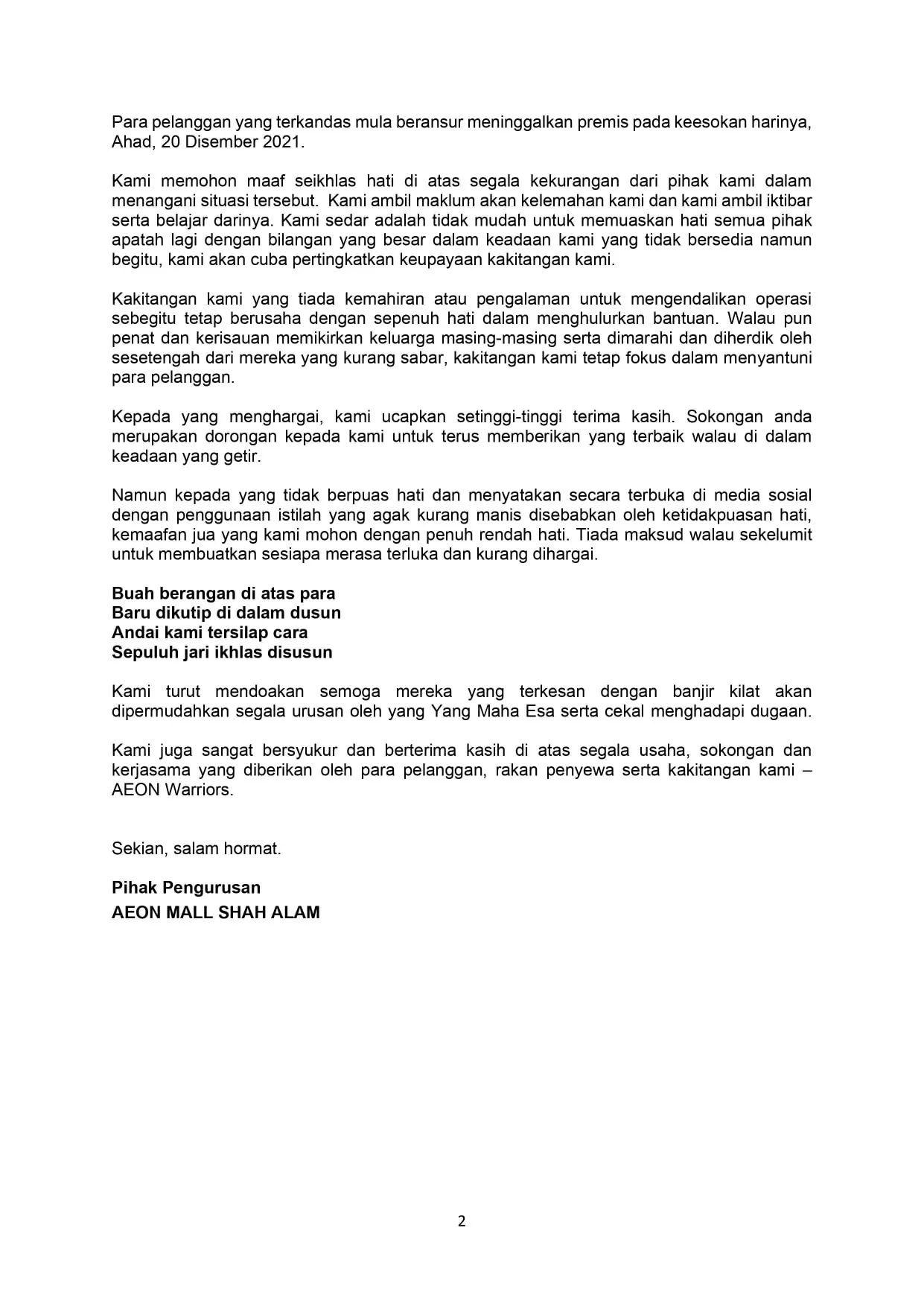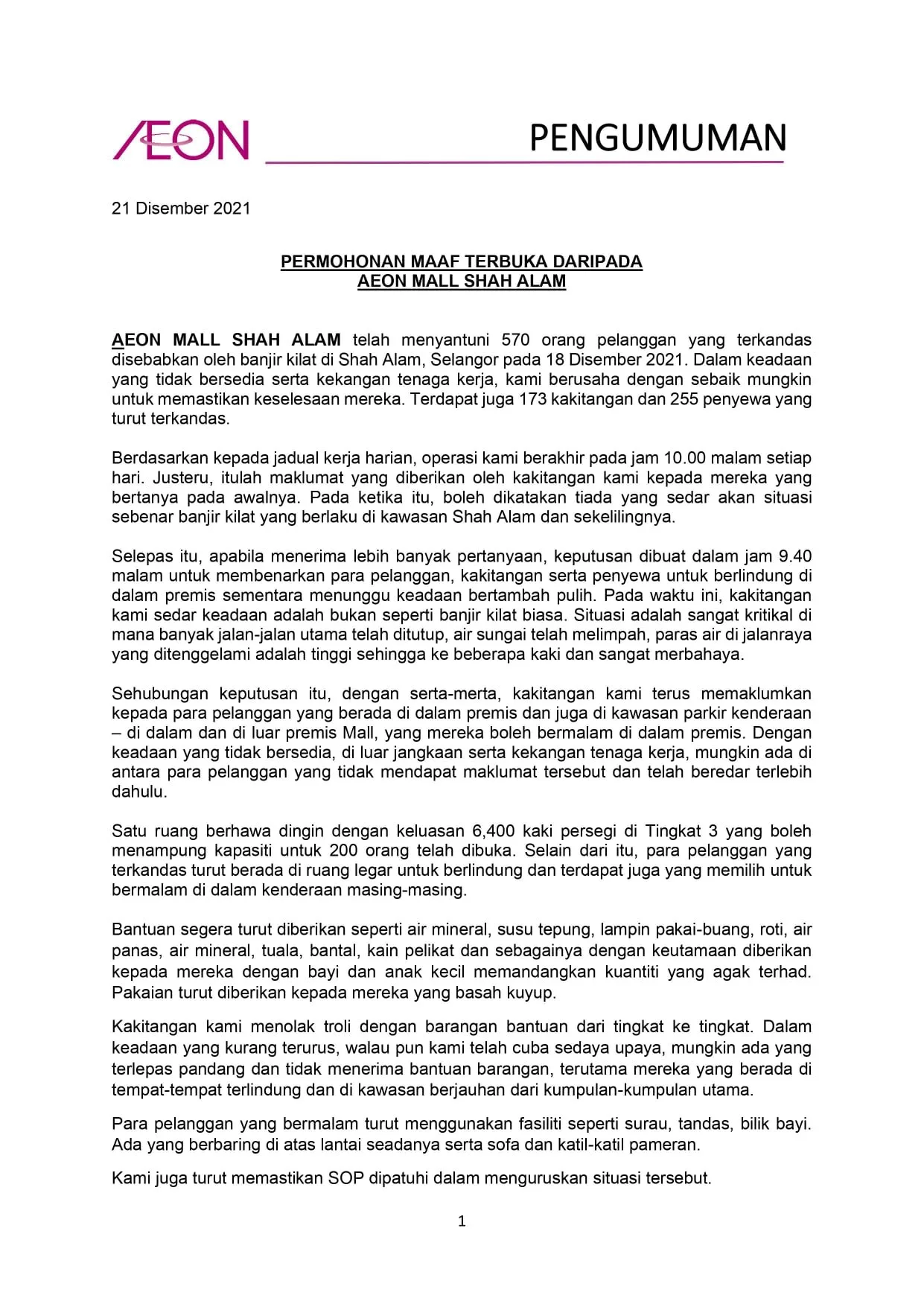 AEON MALL Shah Alam menyantuni 570 orang pelanggan yang terkandas disebabkan oleh banjir kilat di Shah Alam, Selangor.