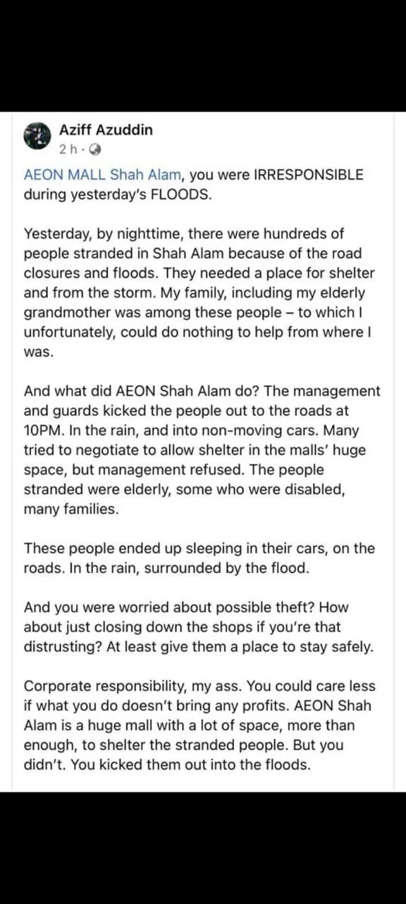 However, to their disappointment, the management and security guards of AEON Mall Shah Alam kicked them out of the mall for fear of theft risk! All of those who sought shelter at AEON Mall Shah Alam were forced to either stay in their cars or stand by the roadside in the rain at night. There were children, the elderly and disabled people amongst the flood victims whom AEON kicked out.