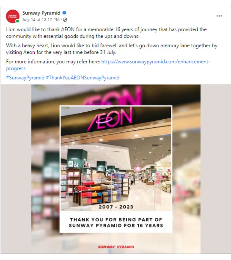 In their Facebook post, Sunway Pyramid thanked the retail store for the 16 years of serving the community with essential goods. The mall also encouraged customers to visit AEON Sunway Pyramid for the last time before its closure.