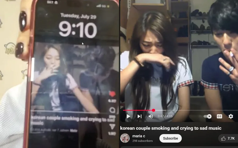 During a fan signing on 29th July (Tuesday), Giselle amused MYs (aespa fans) by revealing her current phone lockscreen, sparking laughter throughout the audience. It showed a screenshot from an 8-year-old YouTube video of a couple smoking and crying while listening to music, a clip that had become a widely recognised meme.
