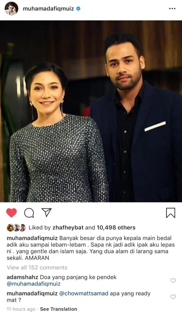 One of the highlights in this post is the use of word “dua alam (gay)” in his caption, which might give evident reference to his sister’s ex-fiancé. Afiq’s caption can be taken as a warning sign towards Syafie.