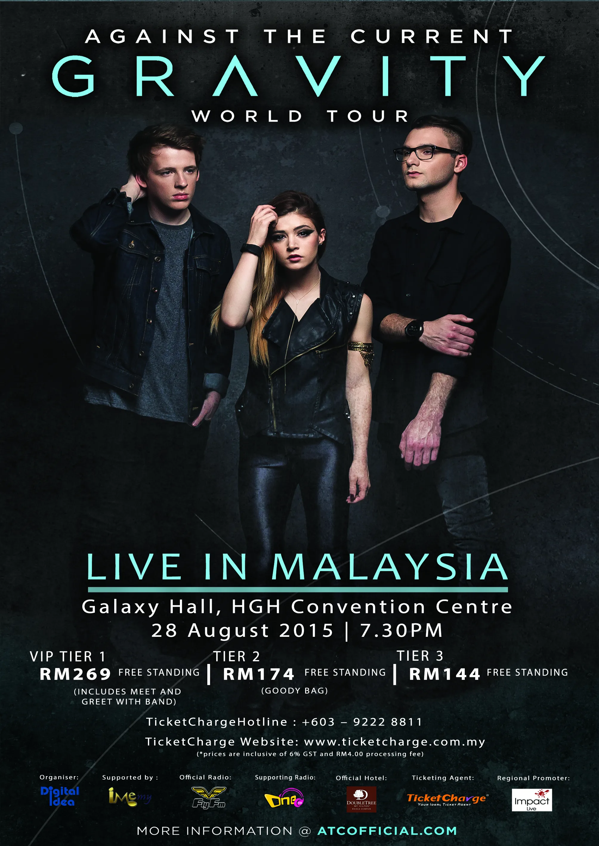 Digital Idea is the promoter for Against The Current “Gravity” Live in Malaysia 2015. Concert tickets were launched on 15th June (Monday) at 10 am via Ticketing Agent, Ticket Charge. To purchase tickets, you may log on to Ticket Charge’s official website and contact their hotline at +603-92228811. Tickets are also available at Ticket Charge office and at selected stores including Speedy Music Store, Rock Corner Music store, Victoria Music Center, and Neway Karaoke outlet.