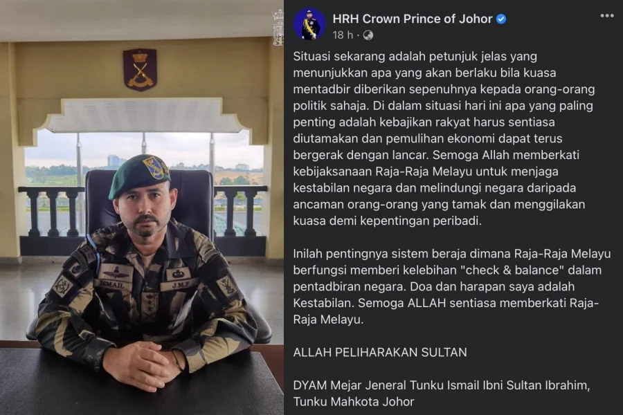 Subsequently, Tunku Mahkota Johor (TMJ) Tunku Ismail Idris also took to his Facebook to address the situation. The Crown Prince of Johor wrote, “The current situation is a clear indication of what would happen when power to rule is left entirely to politicians only. In today’s scenario, the most important thing should be prioritising the people’s welfare and ensuring the economy continues to recover efficiently.”