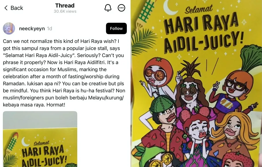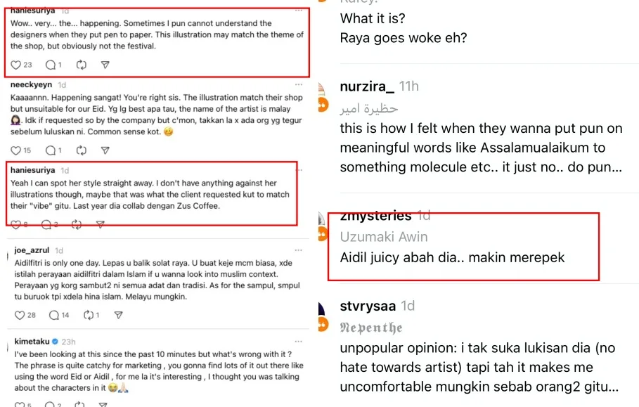 The user urged the brand to be more mindful when designing artwork for their products or campaigns, particularly when it involves a religious occasion. The post sparked discussion among netizens, with some criticising the illustrator for failing to create a more appropriate depiction of Raya, while others blamed the brand for approving the design for their Raya campaign.