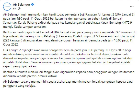 The post stated that the accident caused a chemical contamination at Sungai Semantan, Pahang. As a result, they had to stop all tasks at the Langat 2 Water Treatment Plant (Langat 2 WTP) around 4.30am today. They went on to say that 397 areas in three regions of Air Selangor will be experiencing supply disruption.