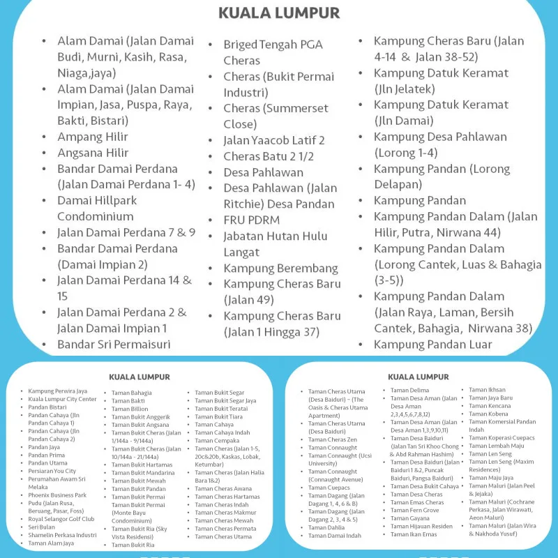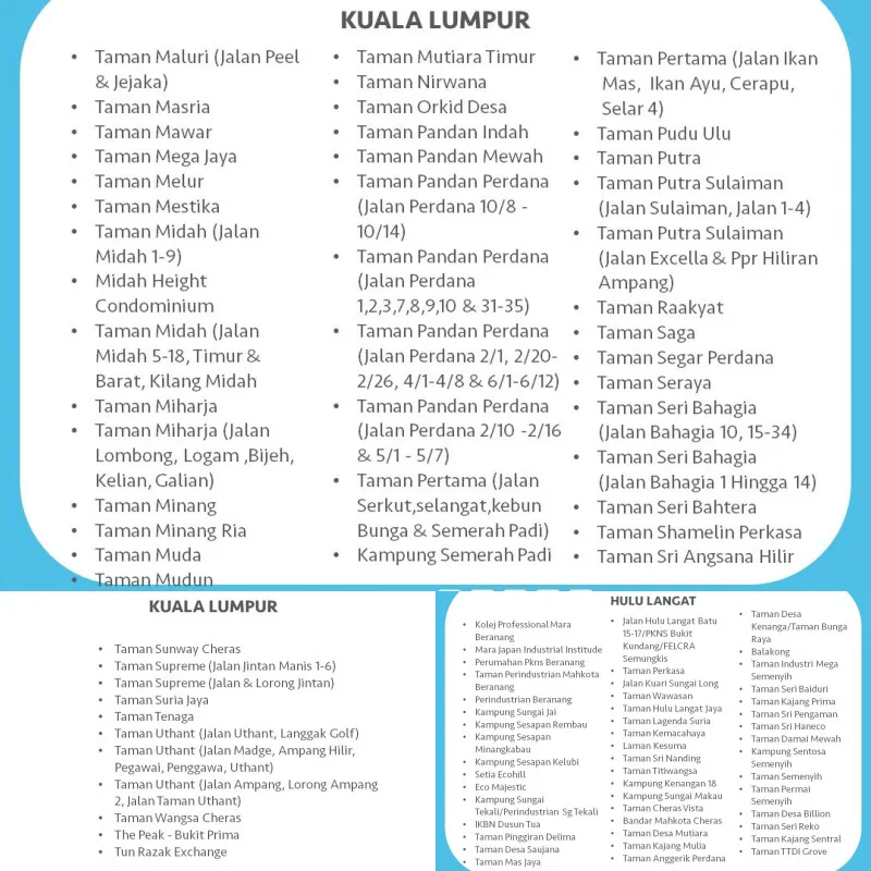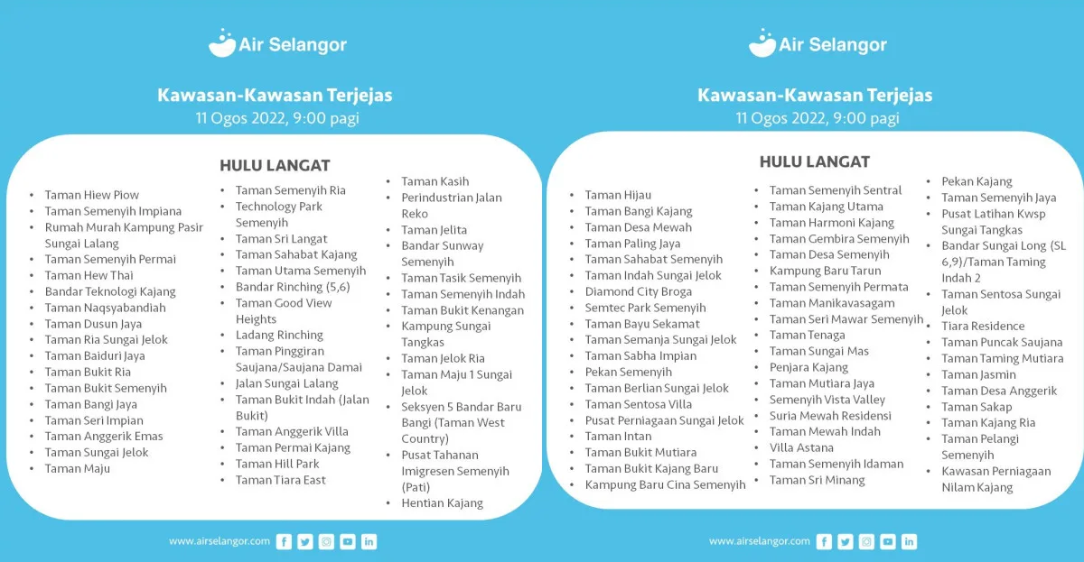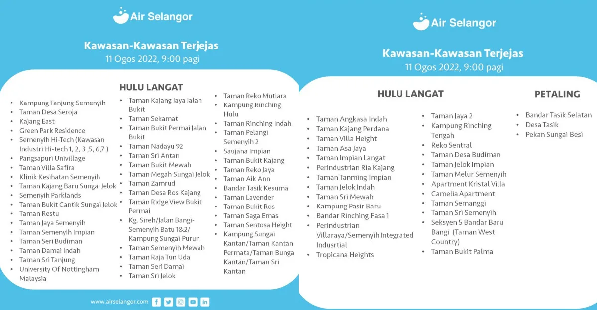 The areas are located in Petaling, Kuala Lumpur and Hulu Langat. The disruption, which began at 10am, is expected to continue until 3.30pm when they will resume operations at LRA Langat 2. Then, they will be distributing treated water supply to consumers after the system has been stabilised. In the meantime, water tanks will be mobilised to consumers with priority given to critical premises.
