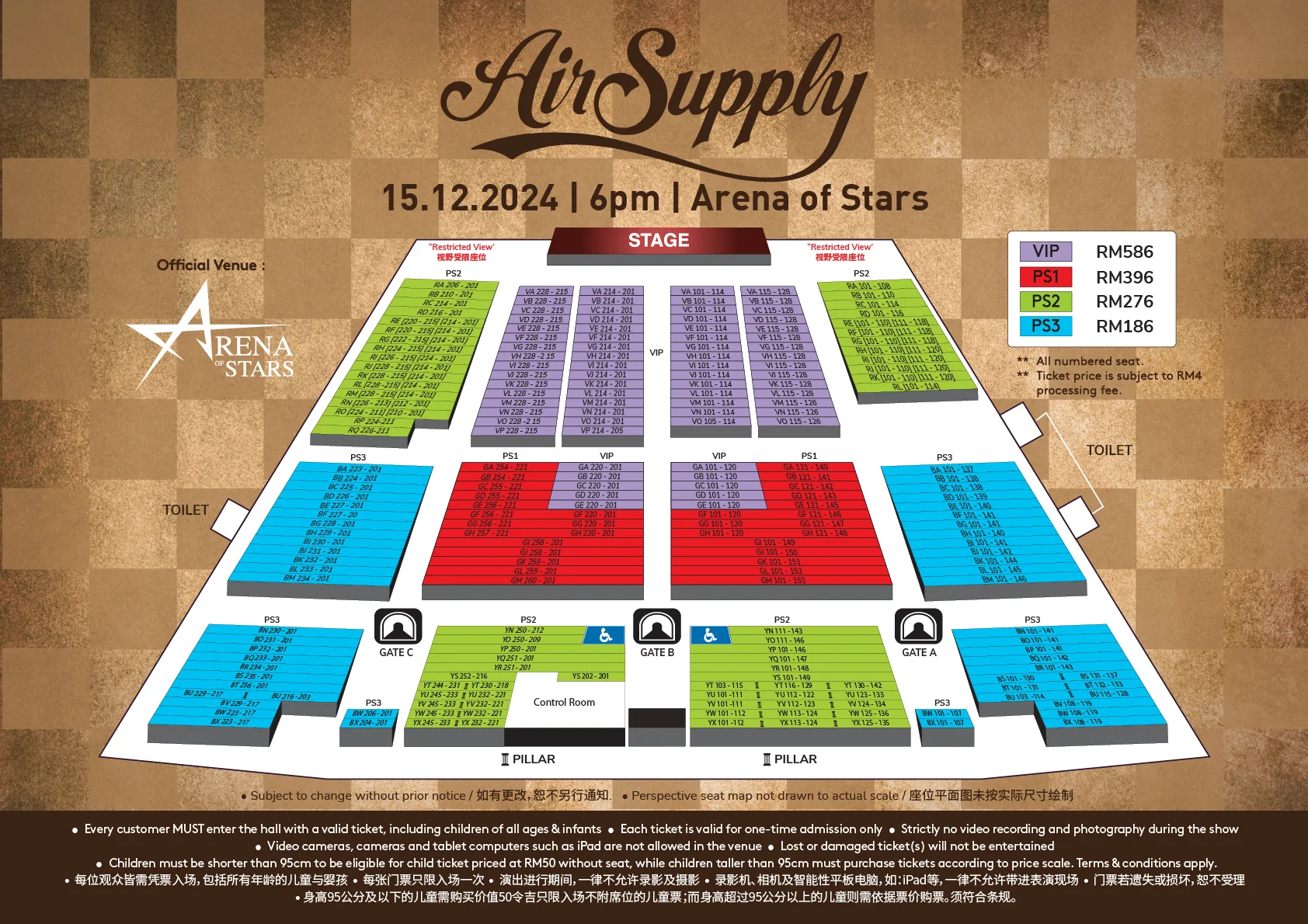 - Ticket price: RM586 (VIP), RM396 (PS1), RM276 (PS2) and RM186 (PS3)