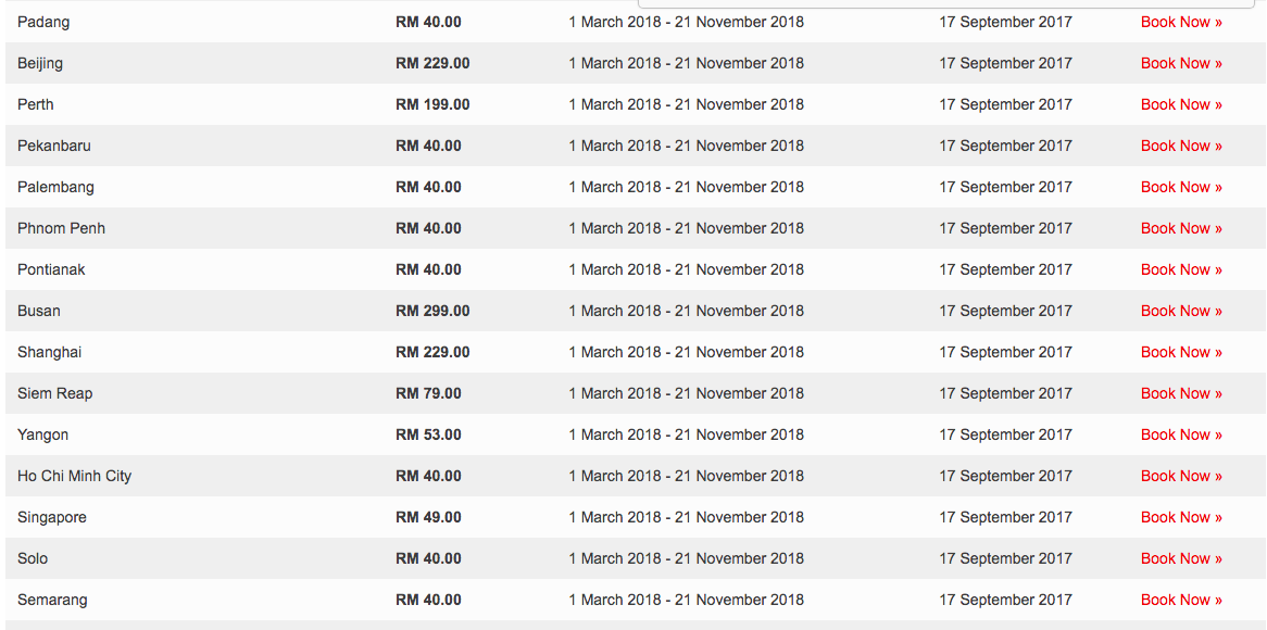 A quick look at the list of domestic destinations taking off from Kuala Lumpur International Airport 2 (klia2) shows the ticket promotion starting from RM15. Those that fall under the cheapest category include Alor Setar, Johor Bahru, Langkawi, Penang, Kuala Terengganu, and more. Here’s a tip: avoid dates around public holidays for the cheapest ticket options.