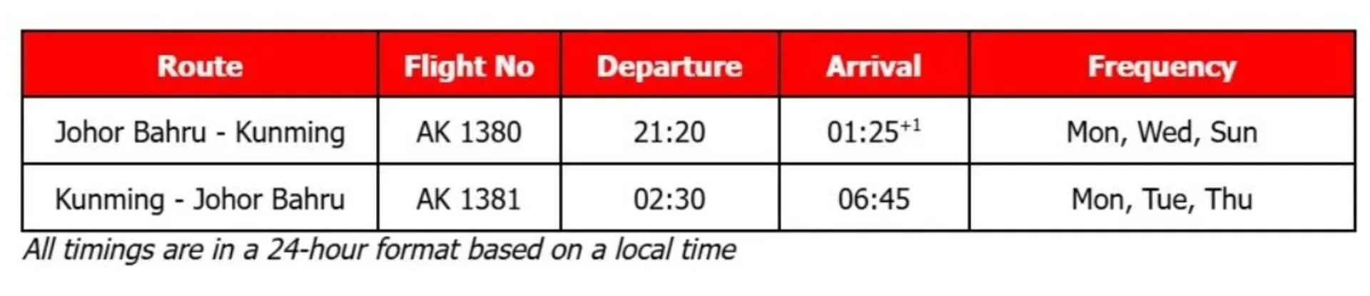 Flight Schedule between Johor Bahru (JHB) and Kunming (KMG):