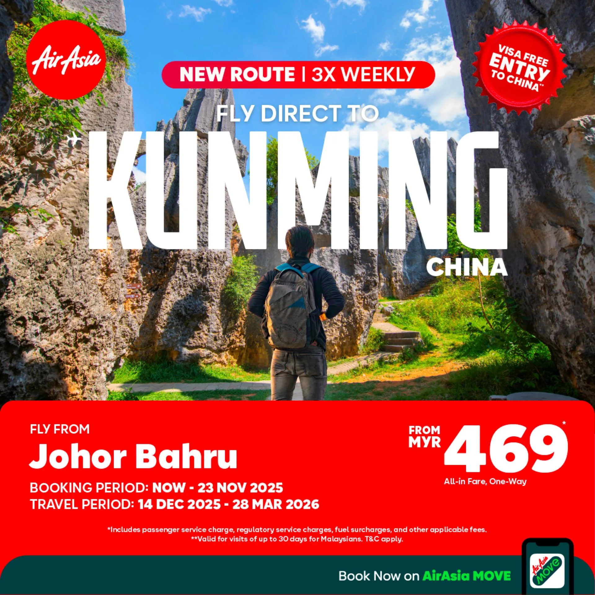 “We are not just growing our network, we are redefining Malaysia’s connectivity within the region to the world. The launch of this new Johor Bahru-Kunming route marks our commitment to expanding beyond Kuala Lumpur and strengthening key regional hubs across the country. By linking Johor Bahru directly to Kunming, we are opening new opportunities for trade, tourism and cultural exchange, turning connectivity into an engine of economic growth at both ends. With the mutual visa-free initiatives between Malaysia and China, it is now easier than ever for more people to explore, experience and connect across borders. This is AirAsia’s commitment in action to make global connectivity accessible, affordable and inclusive for all.” Said Dato’ Captain Fareh Mazputra, CEO of AirAsia Malaysia