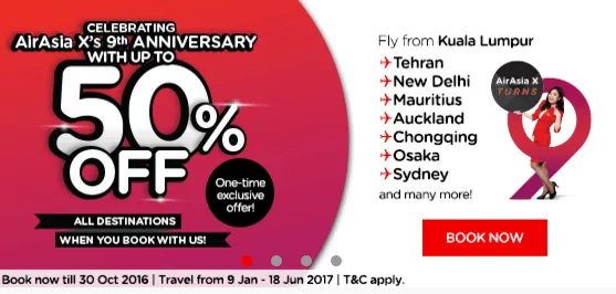 In conjunction with AirAsia X’s 9th anniversary, the budget airline is offering discounts of up to 50% for all its destination! Booking starts from Monday (24th October) till 30th October for a travel period between 9th January 2017 to 18th June 2017.