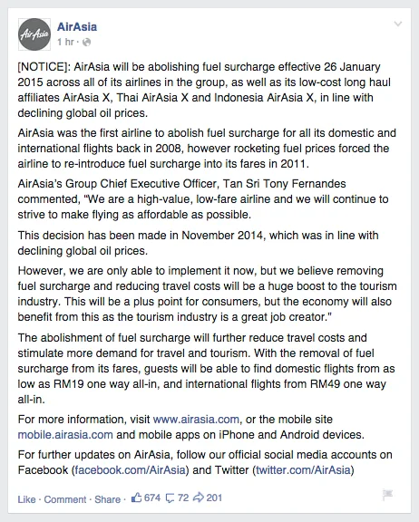 Just today, AirAsia Bhd announced via their Facebook page that they’ll be abolishing their fuel surcharge fees across all airlines in the group. This includes its low-cost long-haul affiliates, AirAsia X, Thai AirAsia X, and Indonesia AirAsia X, in line with declining global oil prices.