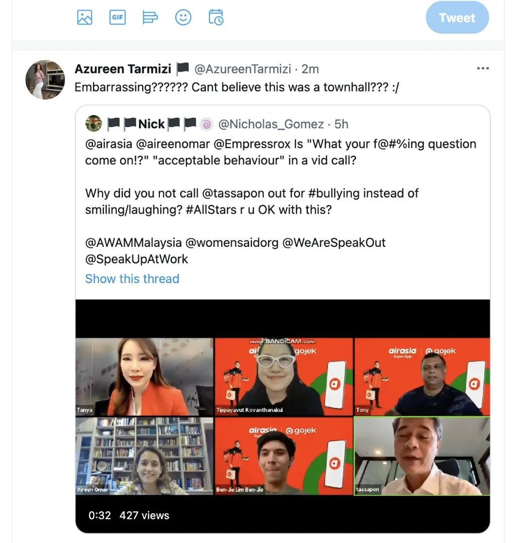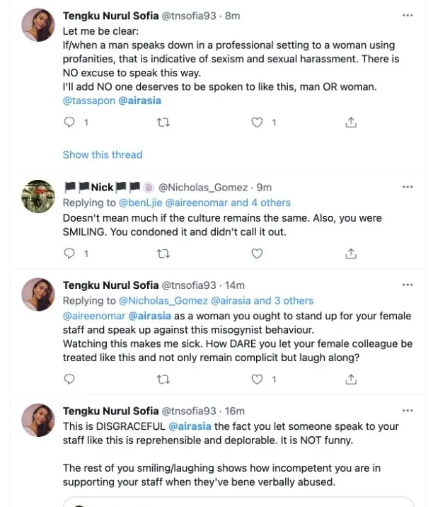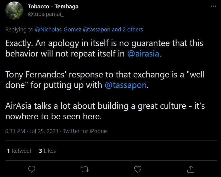 Another person commented that, “This is absolutely disgusting behaviour. It is ridiculous that not only @tassapon believes it’s okay to speak that way to a colleague, but that AirAsia leadership @aireenomar and Tony F simply let it slide is appalling.”