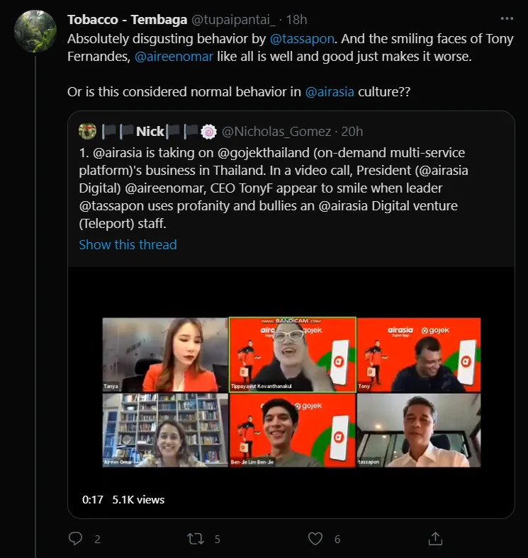AirAsia’s leadership and workplace environment was brought into question after a video call between AirAsia Group and Gojek Thailand was uploaded on Twitter. In case you didn’t know, AirAsia recently announced its partnership with Gojek’s Thailand business with plans to venture into digital business.