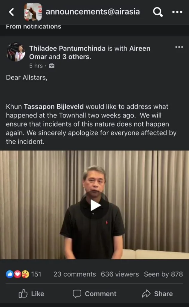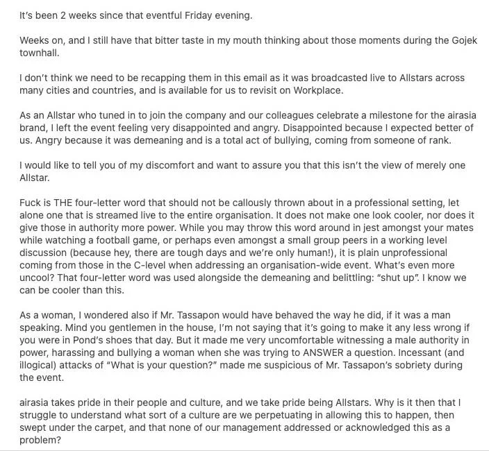 The video sparked outrage from netizens as they were disappointed over the behaviour of a leader who was behaving inappropriately in a professional setting. One of the AirAsia AllStar staff who tuned in to the event also expressed her displeasure over the incident in her writing. “F**k is a four-letter word that should not be callously thrown about in a professional setting, let alone one that is streamed live to the entire organisation. It does not make one cooler, nor does it give those in authority more power,” the staff remarked in the writing.