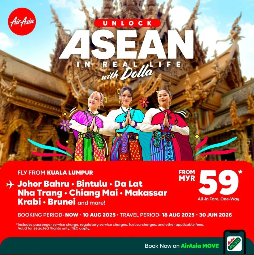 To further spark the passion for travel across Asean, AirAsia is offering all-in** one-way fares from RM59 to destinations such as Johor Bahru, Bintulu, Da Lat, Nha Trang, Chiang Mai, Makassar, Krabi and Brunei, with bookings available until 10th August 2025 for travel between 18th August 2025 and 30th June 2026.